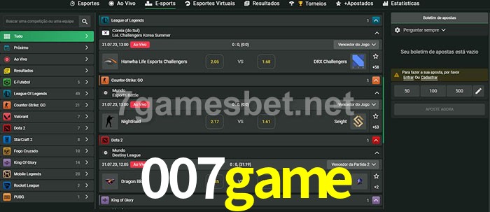 O 007game oferece uma grande seleção de opções de apostas em e-sports com probabilidades competitivas